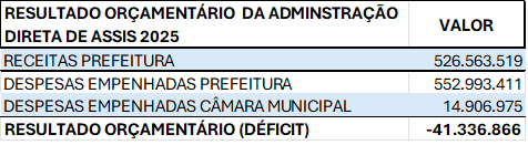 A Administração Direta do município de Assis apresentou um déficit orçamentáriode R$41.336.866, que representa 7,9% das Receitas.
