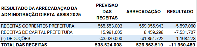 Os dados mostram que o município enfrentou dificuldades para alcançar o nível de arrecadação esperado em 2025. Isso pode estar relacionado a fatores econômicos, revisão de projeções ou comportamento das receitas tributárias.